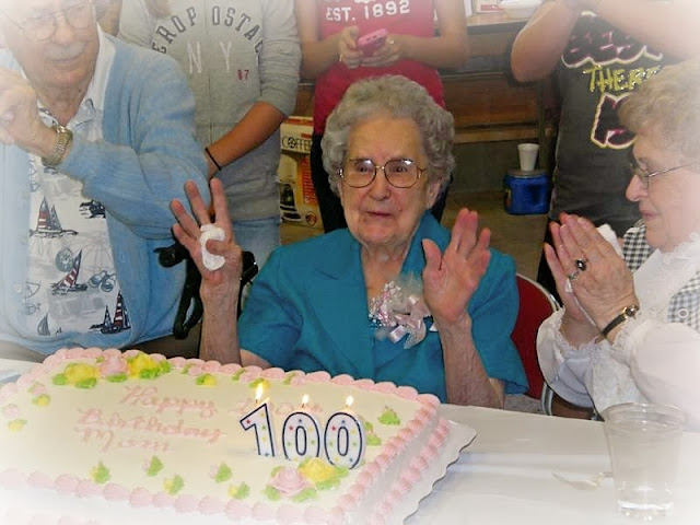 When you have lived so long for the Lord, and you are 103, it's a little hard to be sad for too long when you know they are in the presence of Jesus. And her mother and father. And her brother and four sisters! Oh, what a happy reunion was going on in heaven that day! This photo as you can see was taken three years ago at her 100th Birthday party. Wasn't she just the cutest thing?